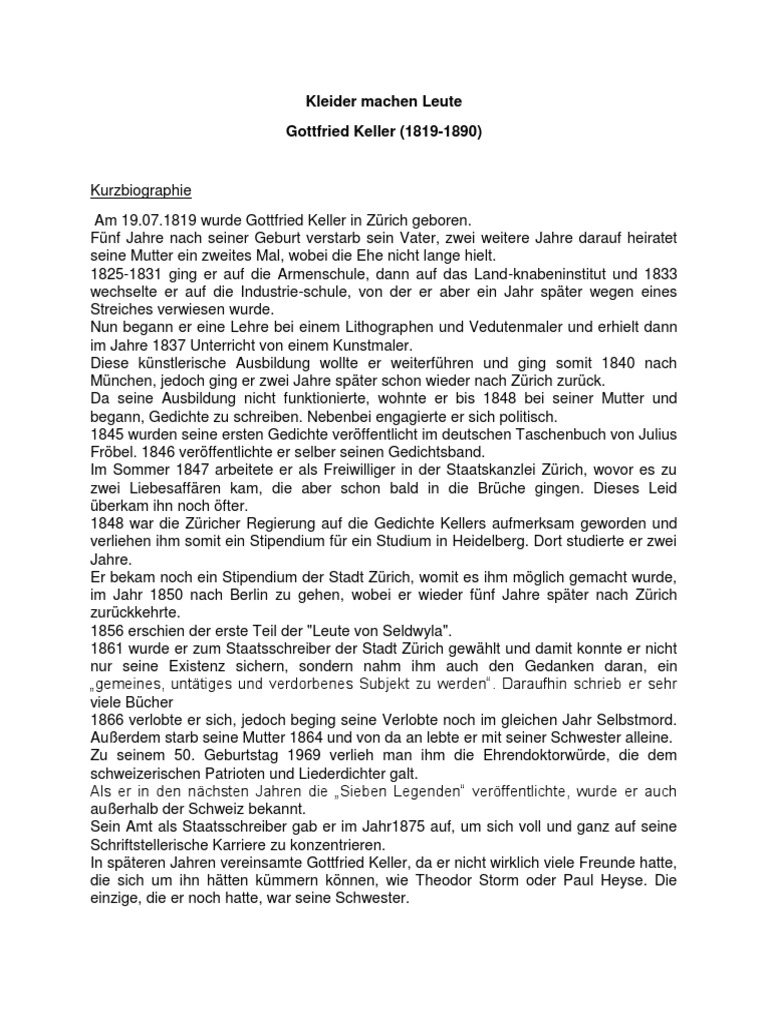 Keller Gottfried - Kleider machen Leute kurze Charakterisierung Wenzel Strapinski Keller Gottfried. Ihr Vater ist Amtsrat und moechte seine Tochter wie zu Zeiten Gottfried Kellers ueblich mit einem angesehenen Buerger verheiraten. Die Auswahl wurde auf 25 Dokumente mit der groessten Relevanz begrenzt.