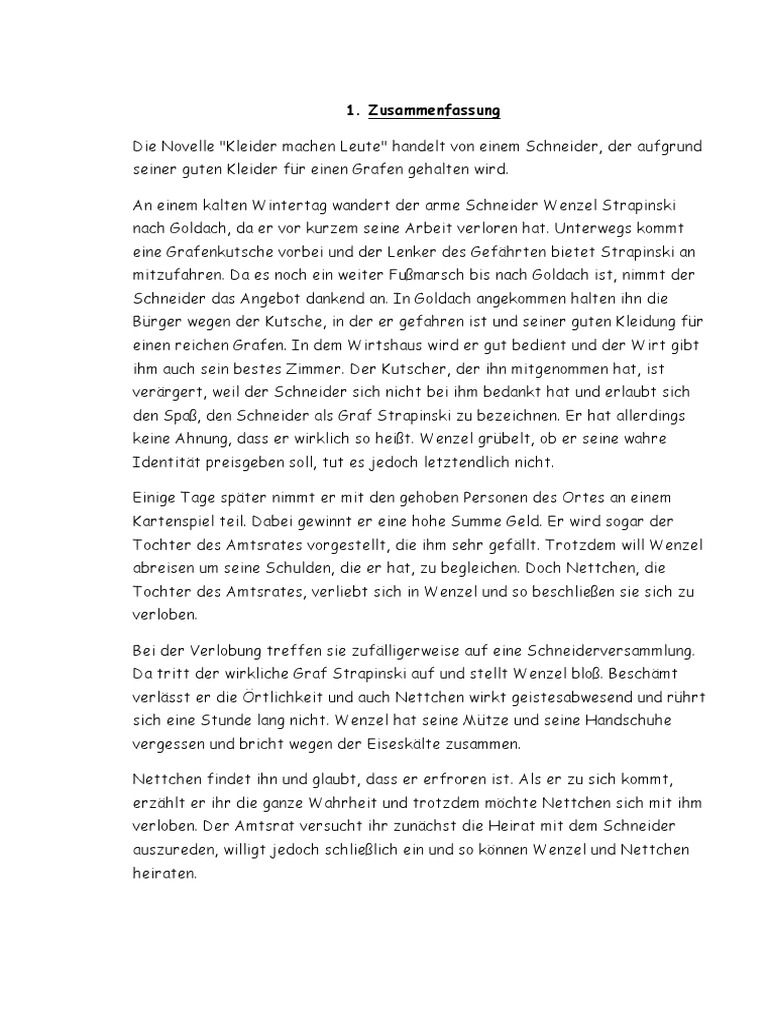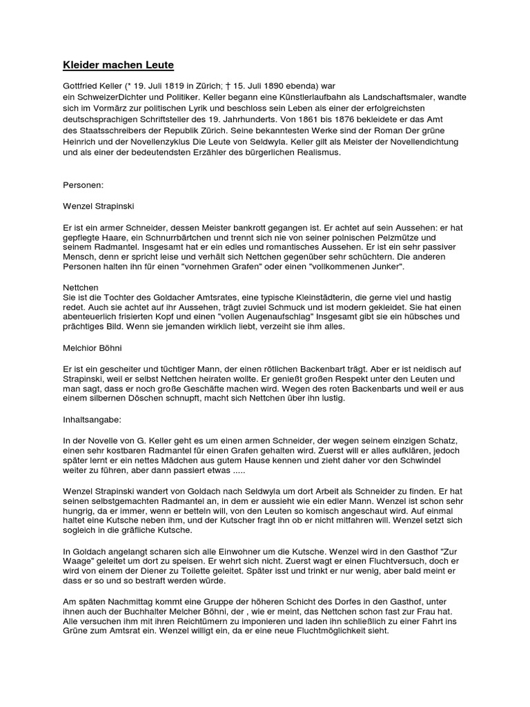 Zusammenfassung kleider machen leute. Posted on October 27 2016 by admin. Die Novelle Kleider machen Leute des Schweizer Dichters Gottfried Keller stammt aus dem zweiten Band der Novellensammlung Die Leute von Seldwyla und gehoer. Der arme Schneider Wenzel Strapinski wird arbeitslos und verlaesst sein Heimatdorf Seldwyla.